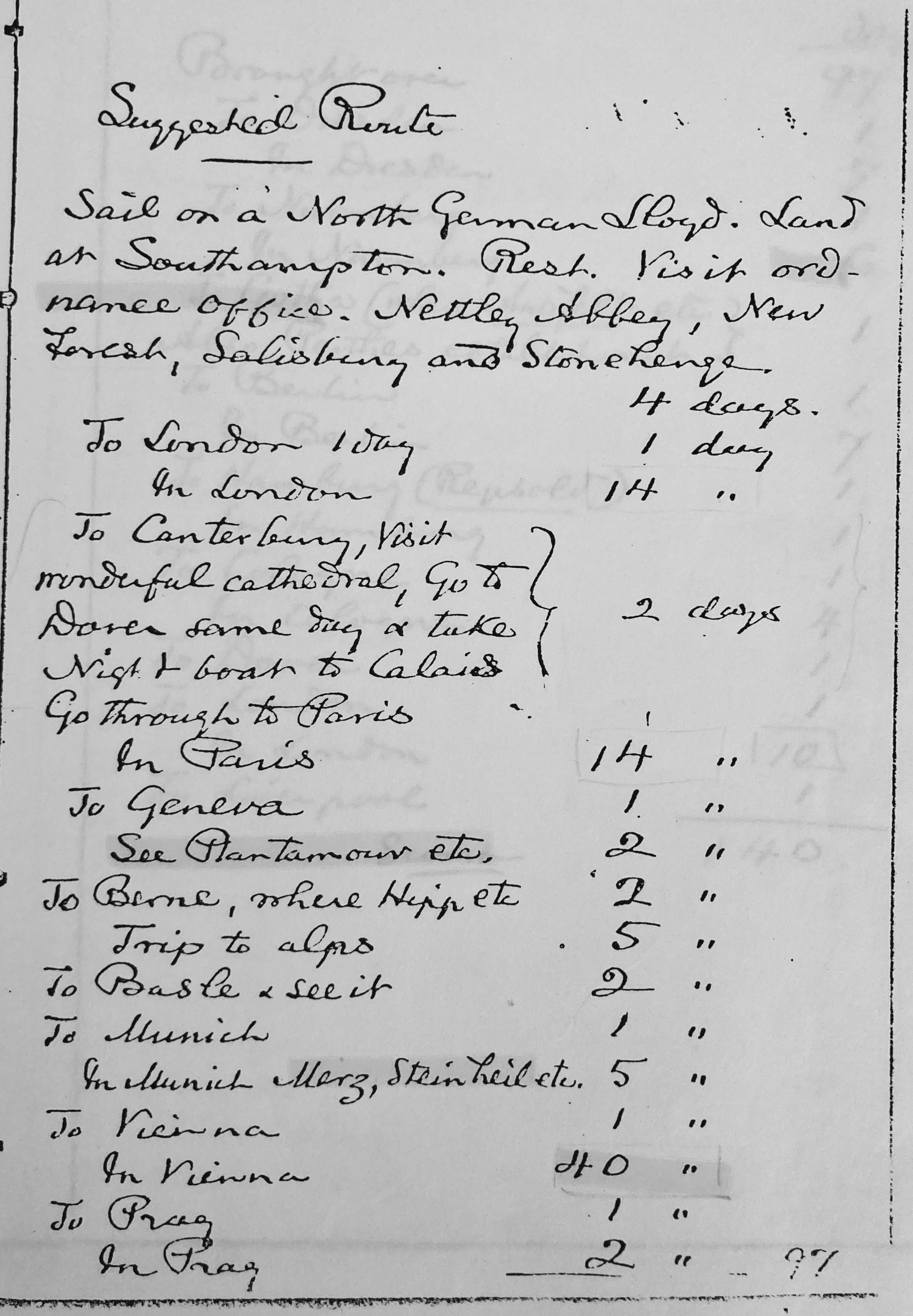 Se trata de la decimoctava y decimonovena hojas del cuaderno en el que C. S. Peirce anota algunas sugerencias para el viaje a Europa de un colega del Coast Survey a partir de las experiencias acumuladas en sus dos primeros viajes por Europa. Está dedicada a describir la ruta que le parece más acertada e indica el tiempo que puede invertirse en cada lugar.