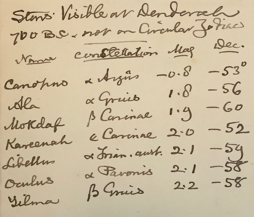En la Houghton Library entre los C. S. Peirce Papers se conserva la anotación de la derecha con datos de las estrellas visibles en Denderah 700 años a. de C. (MS 1059). |