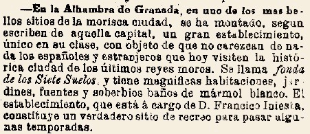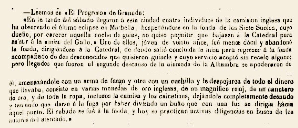 Como curiosidad, hemos localizado en el periódico de Barcelona La Convicción del 4 de enero de 1871 (pp. 74-75) la siguiente crónica tomada de El Progreso de Granada que guarda alguna relación con la observación del eclipse y con la fonda de los Siete Suelos: