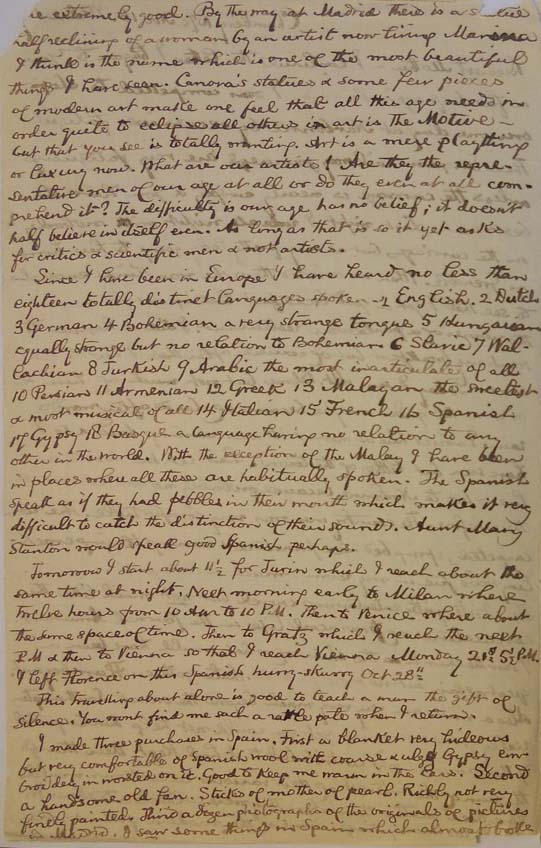 Por cierto, en Madrid hay una estatua de una mujer medio reclinada [hecha] por un artista que vive actualmente, Marina5, me parece que es el nombre, que es una de las cosas más bellas que he visto. Las estatuas de Canova y algunas otras pocas piezas de arte moderno le hacen a uno sentir que todo lo que esta época necesita para eclipsar completamente a todas las otras en arte es El Motivo, pero lo que ves es que [este] está del todo ausente. El arte es un mero juego o un lujo en la actualidad. ¿Qué son nuestros artistas? ¿Son ellos los hombres representativos de nuestra época o ni siquiera ellos la comprenden? La dificultad es que nuestra época no cree: ni siquiera medio cree en sí misma. En la medida que esto sea así lo que está pidiendo es críticos y científicos, no artistas. Desde que estoy en Europa he oído hablar no menos de dieciocho lenguas totalmente distintas. 1 inglés 2 holandés 3 alemán 4 bohemio, una lengua muy extraña 5 húngaro, igualmente extraño pero sin relación con el bohemio 6 eslavo 7 valaco 8 turco 9 árabe, el más inarticulado de todos 10 persa 11 armenio 12 griego 13 malayo, el más dulce y más musical de todos 14 italiano 15 francés 16 español 17 gitano 18 vascuence6, una lengua que no tiene relación con ninguna otra del mundo7. Con la excepción del malayo he estado en lugares donde estas lenguas se hablaban habitualmente. Los españoles hablan como si tuvieran piedras en la boca, lo que hace muy difícil captar la distinción de sus sonidos. La tía Mary Stanton8 hablaría quizá buen español. Mañana salgo alrededor de las 11 y media para Turín, adonde llegaré hacia esa misma hora de la noche. La mañana siguiente temprano para Milán donde [estaré] doce horas, de 10 de la mañana a 10 de la noche. Luego a Venecia, donde estaré un tiempo parecido. Luego a Graz, adonde llegaré la noche siguiente y luego a Viena9. Así que llegaré a Viena el lunes 21 a las 5 y media de la tarde. Salí de Florencia10 para esta correría española el 28 de octubre. Esto de viajar solo es bueno para enseñar al hombre el don del silencio. No me encontrarás tan charlatán cuando vuelva. He hecho tres compras en España. Primero, una manta horrible, pero muy cómoda, de lana española con bordados gitanos feos y vulgares. Buena para calentarme en los trenes. Segundo, un hermoso abanico antiguo. Varillas de madreperla. Pintado ricamente, aunque no muy fino. Tercero, una docena de fotografías de los cuadros originales [que he visto] en Madrid11. He visto algunas cosas en España que casi me rompen |