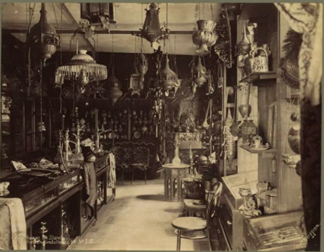 [Fuente: Maison Sadullah & Cie.; Amazon] El bazar es muy entretenido. Es un lugar grande que tiene muchas calles, una ciudad perfecta de pequeñas tiendas –todas bajo un mismo techo. Cuando deseas comprar algo, apartas todo lo que quieres, generalmente después de haber mirado todo el contenido de la tienda, y preguntas el precio. Cuando preguntas, te invitan a sentarte si todavía no lo has hecho y te traen una taza de café y un cigarrillo. Expresas el mayor asombro ante el precio que el hombre anuncia, no de forma ofensiva sino como si ¡ay! encontraras que está mucho más allá de tus posibilidades. Después de esto una larga discusión de la calidad de los bienes y finalmente ofreces quizás un tercio de lo que había pedido. Esto es por supuesto rechazado y te marchas. Mientras te vas, él ofrece probablemente una suma menor pero la rechazas y te marchas. Después de una hora o así envías a un mensajero con una pequeña mejora de tu precio original. Probablemente eso también sea rechazado. Entonces esperas hasta el día siguiente, cuando vuelves otra vez y tienes una larga charla, quizá de un par de horas o así. Dicen que nada que cueste más de un napoleón de oro debería comprarse en menos de tres días.