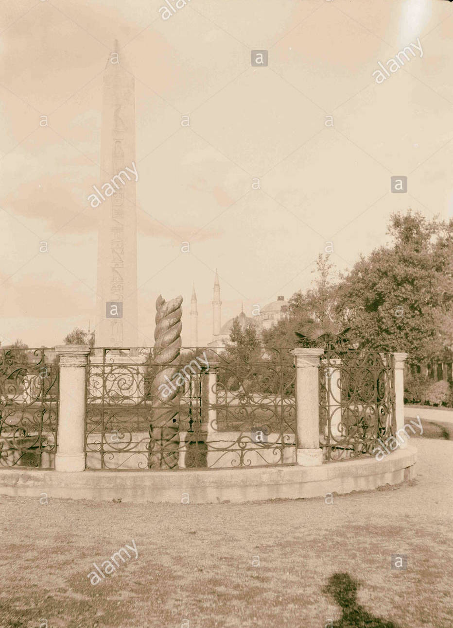 [Fuente: Alamy] Un poco detrás de esta mezquita está el hipódromo, en el que hay dos obeliscos, uno de pequeñas piedras, antiguamente cubierto de losas y el otro un monolito de granito con jeroglíficos egipcios; se sostiene sobre cuatro cubos de cobre y el pedestal está cubierto de bajo relieves romanos, bajo los cuales hay una inscripción latina que afirma que fue colocado por el emperador Teodosio. Entre los dos hay una columna rota de bronce retorcido.