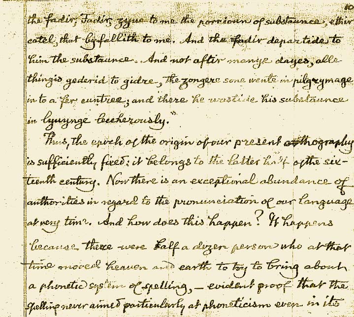 Un hombre tenía dos hijos, el menor le dijo al padre, "Padre dame la parte de la hacienda que me corresponde". Y él les repartió sus bienes. Y no muchos días después, juntándolo todo el hijo menor, partió lejos a una provincia apartada y allí desperdició su hacienda viviendo perdidamente. De este modo, la época de origen de nuestra ortografía actual está lo suficientemente fijada: pertenece a la segunda mitad del siglo 16. Ahora hay una excepcional cantidad de autoridades con respecto a la pronunciación de nuestra lengua en este momento. Y, ¿cómo ha ocurrido? Ha ocurrido porque había una docena de personas que en aquel momento movieron cielo y tierra intentando crear un sistema fonético de la ortografía, - una prueba evidente de que la ortografía nunca apuntó especialmente hacia el foneticismo ni incluso |
