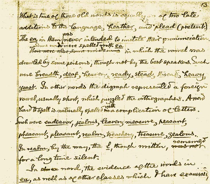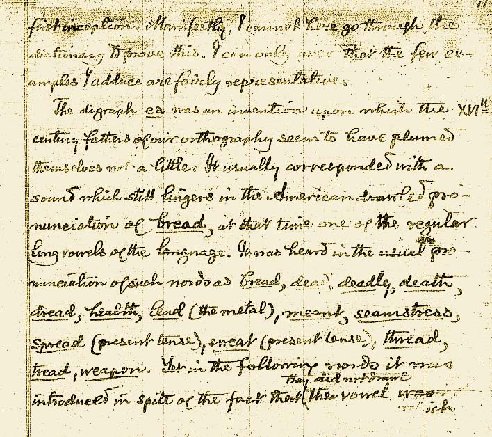 Lo que es auténtico de estas antiguas palabras igualmente lo es para dos de las últimas adiciones al lenguaje como son, heather (brezal), y plead (pretérito) (rogar). La ea que contienen nunca pretendió imitar su pronunciación. Algunas palabras se escribían con ea en las que la vocal era alargada por algunas personas, aunque no por los mejores parlantes. Es el caso debreadth (amplitud), ,deaf (sordo), heaven (cielo), ready (listo), stead (ventaja), thread (rosca, ensartar), heavy (pesado), yeast (levadura). En otras palabras, el dígrafo21 representa una vocal extranjera, normalmente corta, que desconcierta a los ortógrafos. Una palabra difícil de escribir se deletrea naturalmente con una complicación de letras. Es el caso de endeavor (esfuerzo, esforzarse), jealous (celoso), leaven (levadura), measure (medida, medir), peasant (campesino), pheasant (faisán), pleasant (agradable), realm (reino), treachery (traición), treasure (tesoro, valorar), jealous (celoso). En realm, por cierto, la l, aunque se escribe, permaneció muda durante mucho tiempo.