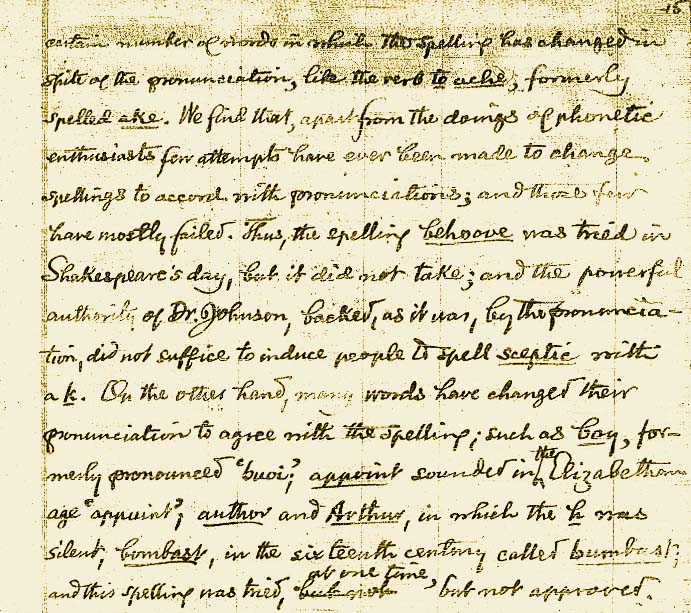 algunas palabras en las que la ortografía se ha modificado a pesar de su pronunciación, como el verbo to ache (doler), que anteriormente se deletreaba ake. Encontramos que, al margen de las acciones de los entusiastas fonéticos, pocos intentos se han hecho nunca para modificar la ortografía de acuerdo con la pronunciación, y esos pocos, han fracasado la mayoría. De este modo, la ortografía conveniente se intentó en la época de Shakespeare, pero no funcionó; y la poderosa autoridad del Dr. Johnson, respaldada, como estaba, por la pronunciación, no fue suficiente como para inducir a la gente a escribir sceptic (escéptico) con k. Por otra parte, muchas palabras han cambiado su pronunciación para concordar con la ortografía; como es el caso de boy (chico), que antiguamente se pronunciaba como “buoi”; appoint (designar) que en la época isabelina se pronunciaba como “appuint”; autor (autor) y Arthur (Arturo), en las que la h era muda, bombast (grandilocuencia), en el siglo dieciséis llamado bumbast; y esta ortografía se intentó una vez pero no fue aprobada.