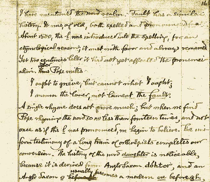 He mencionado la palabra realm (reino). Fault (fallo) tiene una historia parecida. Antiguamente ambas se escribían y pronunciaban faute. En el 1500 aproximadamente, se introdujo la l a su ortografía, por una razón etimológica; agradó y siempre se le cambió el nombre. Aún dos siglos más tarde, todavía no había visto afectada su pronunciación. Como Pope escribe: