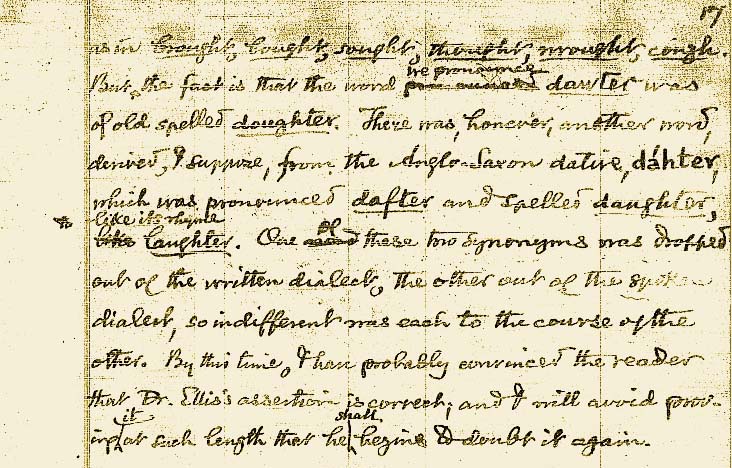 como en brought (pasado de traer), bought (pasado de comprar), sought (pasado de buscar), thought (pasado de pensar), wrought (pasado de escurrir), cough (tos). Pero el hecho es que la palabra que pronunciamos como dawter, antiguamente se escribía como doughter. Sin embargo, hubo otra palabra derivada, supongo, del caso dativo anglosajón como es dáhter, que se pronunciaba dafter y se escribía daughter, como su rima laughter. Uno de eso dos sinónimos abandonaron el dialecto escrito y la otra el oral, con una indiferencia tal que una tenía sobre el curso de la otra. En este punto, probablemente ya habré convencido al lector de que la aserción del Dr. Ellis es correcta; y evitaré demostrarlo tan ampliamente como para que empiece a dudarlo de nuevo.