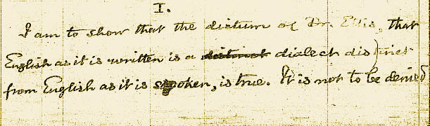 5. "I do not see the value of a standard orthography, but I do see the value of an orthography which reflects the pronunciation of the writer. Our present standard orthography is simply typographical; but in that word lies a world of meaning. It's a tyrant in possession." Ellis defiende una ortografía que sea más que una mera transcripción tipográfica, que refleje la pronunciación del escritor. Por esto llega a calificar a la ortografía tipográfica de su tiempo como una "deshonra a nuestra literatura". Early English Pronunciation, VI, p. 263.