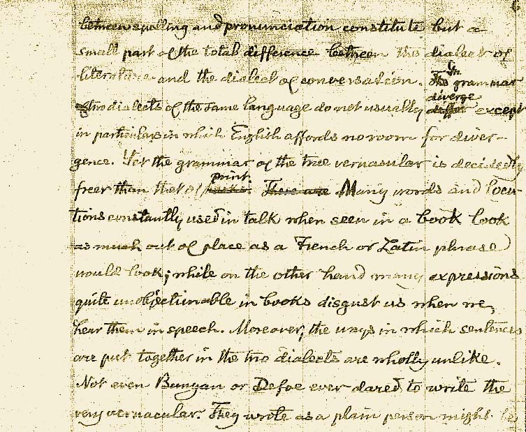 que dos lenguas utilizadas por las mismas personas inevitablemente recibirán influencia una de la otra. El inglés de los irlandeses contiene expresiones tomadas de la lengua irlandesa1; y estoy informado de que el irlandés2 ha estado totalmente afectado por el inglés. Nuestros dialectos tanto escrito como oral3 siendo cada vez más idénticos deben influenciarse naturalmente uno a otro cada vez más. Sin embargo, esta circunstancia aún deja espacio para la independencia en general. Mantengo que cuando el inglés Iiteralmente se disparó hacia la grandeza por vez primera en el siglo dieciséis4 ya era ampliamente diferente a los dialectos orales, y desde entonces, tanto un dialecto como el otro, han atravesado diversos cursos de desarrollo, cada uno, en esencia, en virtud de su propio principio de crecimiento, movidos por su propio genio o afectados directamente