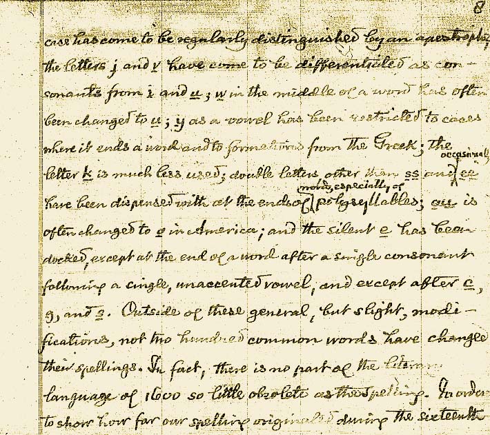 pasó distinguirse normalmente con apóstrofe, las letras j y v a diferenciarse como consonantes derivadas de i y u; la w en medio de una palabra se cambiaba a menudo por u; la y como vocal se restringía a casos en los que aparecía al final de una palabra y a formaciones procedentes del griego; la letra k se usaba mucho menos; las letras dobles, distintas de ss y en ocasiones ee, se dejaron para los finales de palabras, principalmente las polisílabas; la ou a menudo se sustituía por o en América; y la e muda permanecía acoplada, excepto al final de una palabra después de una única consonante a la que seguía una única vocal sin acento, y excepto después de c, g, y s. Al margen de estas generales pero pequeñas modificaciones, no menos que doscientas palabras habían modificado su ortografía. De hecho, no hay parte del lenguaje literario de 1600 tan obsoleto como su ortografía10. Para mostrar el alcance de la ortografía que se originó durante el siglo