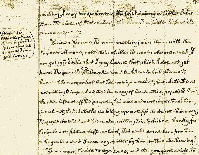 [Nota. Reemplazar estas por mejores muestras en cuanto llegue a la ciudad.] "Lucius11 a famous Roman meeting on a time with the Emperor Marcus12, asked him whether he went; who answered, I am going to Sextus that I may learne that which I doe not yet know. Diogenes the Philosopher went to Athens to Antisthenes13 to learne of him somewhat that hee was ignorant of; but Antisthenes not willing to impart at that time any of his doctrine, repulsed him: the other left not off his purpose, but more and more importuned him, in such sort, that Antisthenes taking up a staffe to drive him away, Diogenes stretched out his necke, willing him to strike on hardly, for he should not finde a staffe so hard, that could drive him from him so long as he might learne any matter by him worthie the hearing." A Lucio, un famoso romano en un encuentro con el Emperador Marco Aurelio, este le preguntó si fue; a lo que le contestó que iba a ir a ver a Sextus para aprender lo que no sabía. Diógenes el filósofo fue a Atenas a ver a Antístenes para aprender de él lo que desconocía, pero Antístenes, no queriendo impartir su doctrina por aquel entonces, lo rechazó y el otro, no cedió en su objetivo sino que lo importunó más en tal medida que Antístenes cogió una bastón para ahuyentarlo a lo que Diógenes extendió la cabeza y le gritó que le pegara fuerte porque nunca encontrará un palo lo suficientemente fuerte para quitarlo de su presencia mientras continuara pronunciando palabras que merecieran la pena. "Sum man hadde tweye sones; and the zongere seide to |