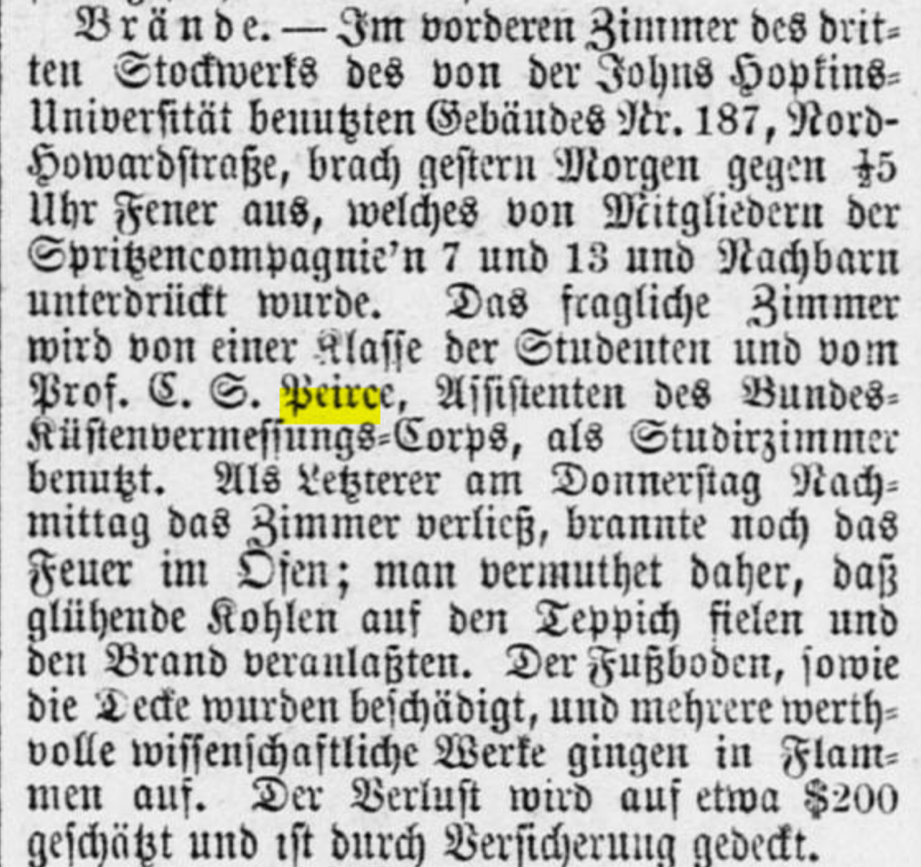 Como curiosidad hemos localizado en un periódico de Baltimore, publicado en alemán, del 17 de enero de 1880 la noticia de un incendio en las dependencias de la Universidad que afectó a la habitación de C. S. Peirce y a alguna de la documentación científica que en ella tenía. Puede leerse aquí debajo la noticia original y a la derecha la traducción preparada por Silvia Döllerer: