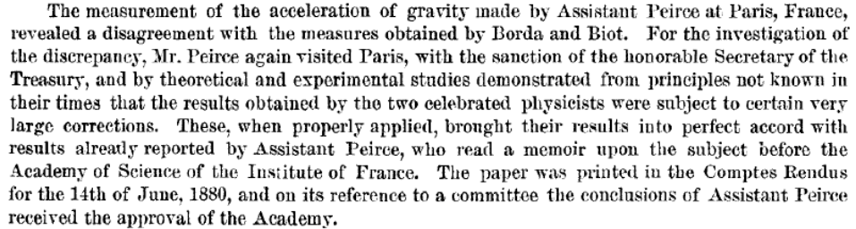 En diciembre de 1880, el superintendente del U. S. Coast Survey, Carlile P. Patterson, en su informe anual presentado al gobierno (Report of the Superintendent of the U. S. Coast and Geodetic Survey for the year ending June 30, 1880, Washington, Government Office, 1882, 20) describe elogiosamente la actividad desarrollada por Charles S. Peirce en París: