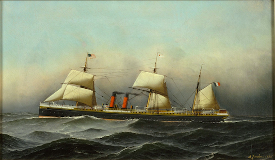 Pintura al óleo del paquebote St. Laurent, 1882, de Antonio Jacobsen [Fuente: Musée national de la Marine] |