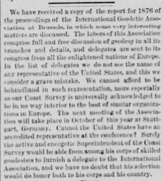 Todos los asistentes se levantaron y el presidente me dio la bienvenida a la asociación, a lo que respondí agradeciéndole en mi nombre y en el del Coast Survey. Después de que se leyeran los informes habituales de diversos países (…) se comenzó de inmediato, aunque no era lo que tocaba, con el asunto del péndulo. El profesor Plantamour, como presidente del comité especial sobre ese tema, abrió la discusión y describió los experimentos que había llegado a hacer como consecuencia de mis investigaciones. (…) Todo el mundo habla de mi trabajo como muy importante y como algo que marca una época en el trabajo pendular.