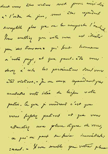 Afortunadamente, las habladurías de toda especie que forman la esencia del bullicio cotidiano se desvanecen como las pompas de jabón y no sobrepasan los límites del lugar de origen. Por esta buena razón todo lo que constituye el contenido de vuestra carta no ha llegado a mi conocimiento ni de manera directa ni de manera indirecta. Ello no impide que vuestra carta me haya causado una dolorosa impresión, no por los motivos acaso exagerados que la han dictado, sino por el estado de vuestro espíritu. Hijo de un país donde los fenómenos |