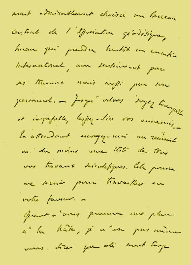 Lo que me gustaría es que permanecierais tranquilo y que esperaseis un puesto digno de usted, lo que no puede lograrse inmediatamente. Me parece que una plaza para usted estaría admirablemente escogida en la Oficina central de la Asociación geodésica, oficina que adquirirá muy pronto un carácter internacional, no solamente por las tareas sino también por su personal2. Hasta entonces permaneced tranquilo e impasible, dejad que murmuren vuestros enemigos. En tanto aguardáis enviadme un compendio o al menos una lista de todos vuestros trabajos científicos3. Eso podrá servirme para trabajar en favor vuestro.