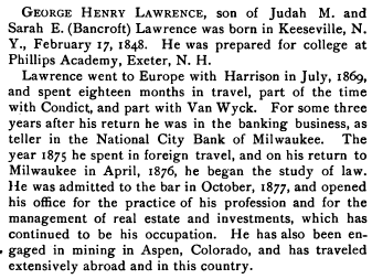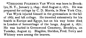 Puede leerse noticia de los viajes de los tres en "Yale Personals", The College Courant, Yale College, New Haven, CT, 15 de enero 1870, nº 2, p. 27. Se reproducen aquí debajo los perfiles biográficos de ambos compilados en una publicación de Yale en las páginas 86 y 158 de Sixth Biographical Record of the Class of 'Sixty-Nine, Yale College 1869-1894'. Compiled and printed in connection with the Quarter Century Reunion, June 26, 1894 (New Haven, The Tuttle, Morehouse & Taylor Press, 1895):