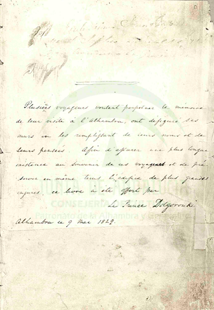Puede leerse el interesante artículo de Javier Arroyo "El príncipe ruso que creó el libro de firmas en la Alhambra para acabar con los grafitis", El País, 22 de octubre del 2018.