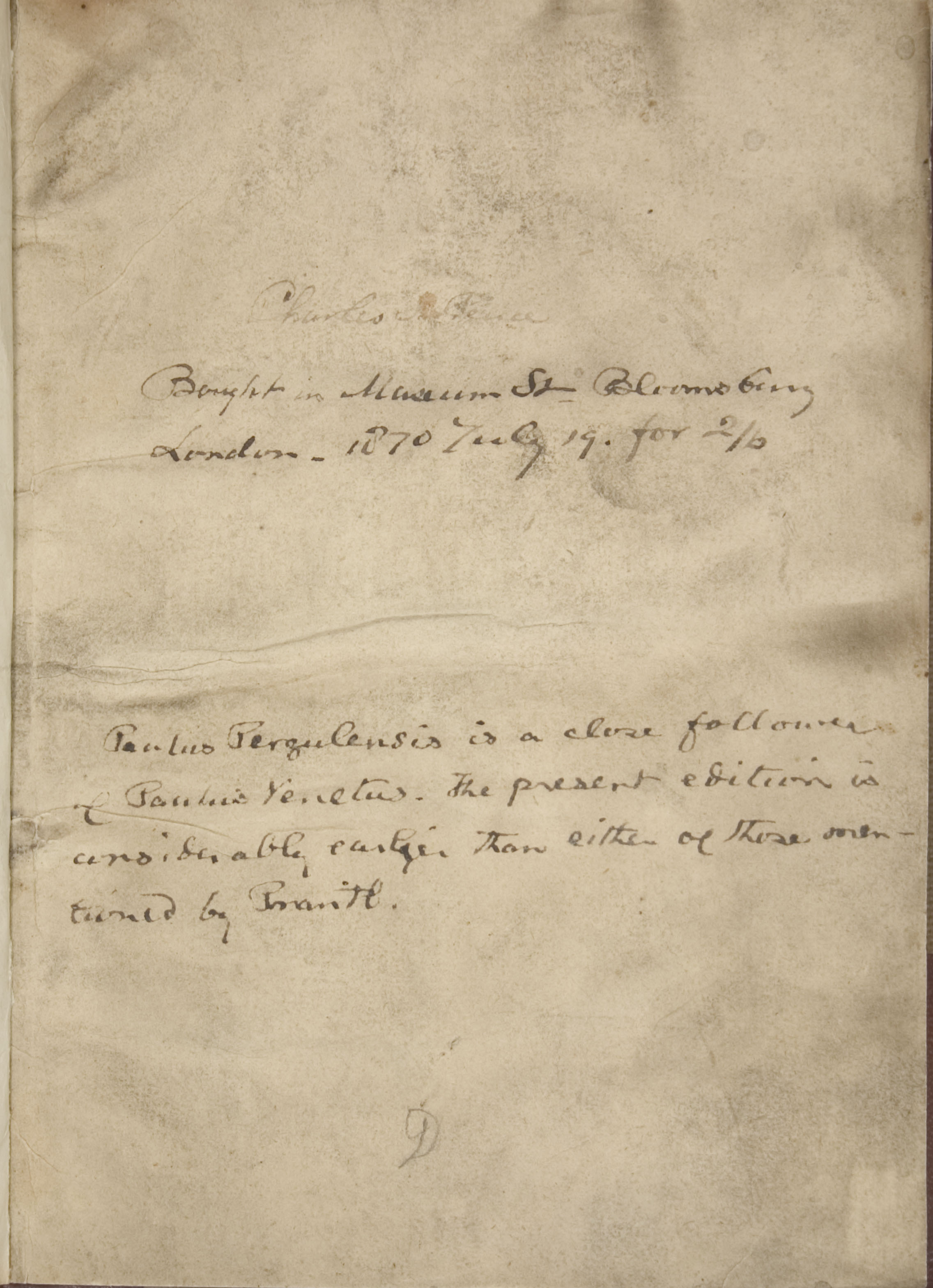 El 19 de julio Peirce adquirió en Museum St., en el barrio londinense de Bloomsbury, por dos chelines y seis peniques (es decir, un cuarto de libra esterlina) el incunable de Paulus Pergulensis Compendium logicae de 14831. El ejemplar que Peirce adquirió en Londres se encuentra actualmente en la Johns Hopkins University (Incun. 1483.P3). He aquí la anotación que hizo Peirce en su primera página: