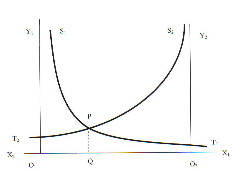Desde cualquier punto O1 tomado como un origen, dibuje el eje de abscisas O1X1, a lo largo del cual debe ser medido x1, el costo total de la primera investigación. Dibuje también el eje de ordenadas O1Y1, a lo largo del cual y1, la urgencia económica de la primera investigación, debe ser medida. Dibuje la curva S1T1 para representar las relaciones de x1 e y1. Tome sobre el eje O1X1, un punto O2 tal que O1O2 mida el costo total de las dos investigaciones. Supongamos que x2, el costo total de la segunda investigación, se mida sobre el mismo eje de x1, pero en la dirección opuesta. Dibuje a partir de O2 el eje de las ordenadas O2Y2 paralelo a O1Y1, y mida y2, la urgencia económica de la segunda investigación sobre este eje. Dibuje la curva S2T2 para representar las relaciones de x2 e y2. Entonces, las dos curvas S1T1 y S2T2 generalmente se cortarán una a otra en algún punto, y sólo en uno, entre los ejes O1Y1 y O2Y2. Desde este punto, digamos P, dibuje la ordenada PQ, y las abscisas Q1Q y O2Q medirán los montos que deben ser gastados en las dos investigaciones.
