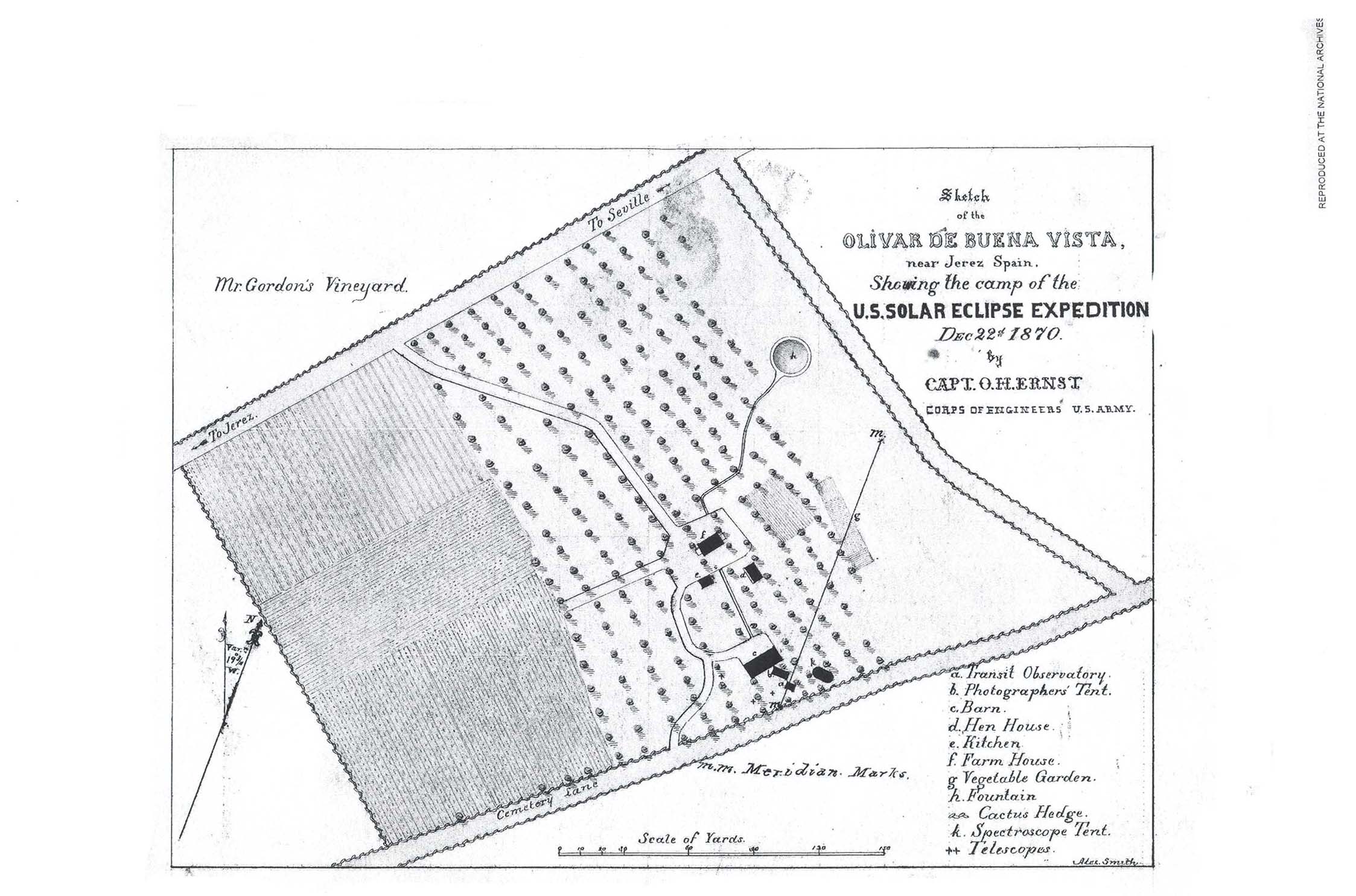 Como se indica en el informe de Benjamin Peirce "el asentamiento principal estaba situado alrededor de una milla al nordeste de la ciudad, en un olivar que pertenecía a los señores Richard H. Davies y su hermano. Estos caballeros pusieron sus terrenos y edificios al servicio de nuestra expedición, y su constante ayuda y generosa hospitalidad con todos los observadores durante su estancia en Jerez es agradecidamente reconocida".