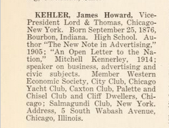 James Howard Kehler (1876-1923) era un periodista interesado en la publicidad, campo en el que fue un pionero. Tuvo abundante trato con escritores y artistas, y una cierta influencia social. Se había casado en 1899 con Elizabeth Osgood. Puede leerse su perfil biográfico en Who's Who in Advertising, Detroit, Business Service Corporation, 1916, p. 40, que se reproduce debajo, y un breve obituario suyo en una publicación de Cliff Dwellers. ![]() Fue el autor de An Open Letter to the Nation with Regard to a Peace Plan (Mitchell Kennerley, Nueva York, 1915). En el libro que reúne las cartas de su hija Betty hay alguna información sobre él (pp. 1, 2, 10-12, 14-16, 20, 180-81), además de la fotografía que se reproduce a la derecha (p. 2). |