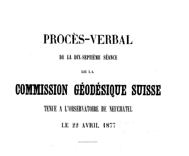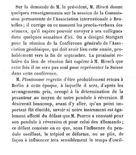 El acta de la sesión del 22 de abril de 1877 de la Comisión Geodésica Suiza se informa con cierto detenimiento de la reunión de la Comisión Permanente de la Asociación Internacional de Geodesia celebrada en Bruselas entre el 5 y el 10 de octubre de 1876. A petición del presidente, prof. R. Wolf, Hirsch dio cuenta de la sesión de la Comisión Permanente celebrada en Bruselas. Plantamour se lamenta de que probablemente no podrá acudir a Stuttgart por sus trabajos en Berlín, y hace una amplia exposición sobre su desacuerdo con Charles S. Peirce; después intervienen también Cellérier y Hirsch.