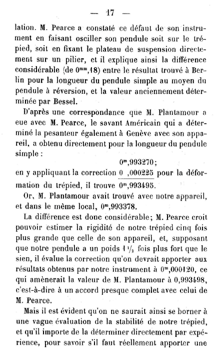 El Sr. Pearce [sic] ha constatado este defecto de su instrumento haciendo oscilar su péndulo, bien sobre un trípode, bien colocando la plataforma de suspensión directamente sobre un pilar, y explica así la diferencia considerable (de 0mm, 18) entre el resultado hallado en Berlín para la largura del péndulo simple por medio del péndulo de reversible, y el valor previamente determinado por Bessel. De acuerdo con la correspondencia que el Sr. Plantamour ha mantenido con el Sr. Pearce [sic], el científico americano que igualmente ha determinado la gravedad en Ginebra con su aparato, ha obtenido para la largura del péndulo simple: 0m,993270; aplicándole la corrección 0 ,000225 por la deformación del trípode, obtiene 0m,993495. Pues bien, el Sr. Plantamour había obtenido con nuestro aparato, y en el mismo local, 0m,993378. La diferencia es, pues, considerable; el Sr. Pearce [sic] cree poder estimar que la rigidez de nuestro trípode es cinco veces más grande que la de su aparato, y, suponiendo que nuestro péndulo tiene un peso 1 1/2 más grande que el suyo, calcula que la corrección que se debería añadir a los resultados obtenidos con nuestro instrumento es 0m,000120, lo que llevaría el valor del Sr. Plantamour a 0,993498, es decir, casi a una concordancia total con el del Sr. Pearce [sic]. Sin embargo, es evidente que no habría que limitarse simplemente a eso, con una imprecisa evaluación de la estabilidad de nuestro trípode, y que es importante determinarla directamente mediante la experiencia, para saber si realmente hay que añadir una |