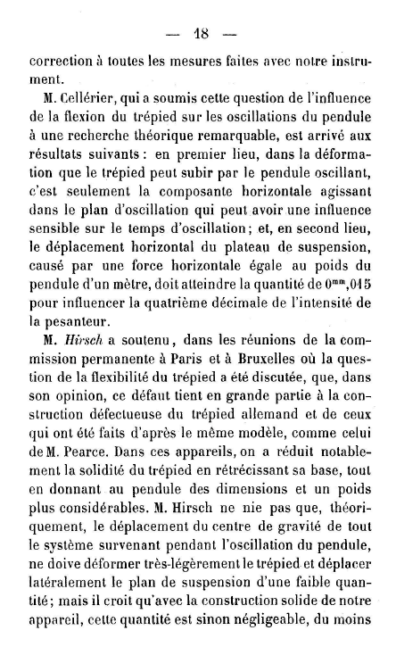 El Sr. Cellérier, que ha llevado a cabo una destacada investigación teórica sobre esta cuestión de la influencia de la flexión del trípode en las oscilaciones del péndulo, ha hecho los siguientes hallazgos: en primer lugar, en la deformación que puede sufrir el trípode por el péndulo oscilante, es únicamente la componente horizontal que actúa en el plano de oscilación la que puede ejercer una influencia sensible sobre el tiempo de oscilación; y, en segundo lugar, el desplazamiento horizontal de la plataforma de suspensión, causado por una fuerza horizontal igual al peso del péndulo por metro, debe alcanzar el valor de 0mm,015 para influir un cuarto de decimal en la intensidad de la gravedad. El Sr. Hirsch ha sostenido, durante las reuniones de la comisión permanente en París y en Bruselas, en las que se ha discutido la cuestión de la flexibilidad del trípode, que, en su opinión, ese defecto se debe en gran medida a la defectuosa construcción del trípode alemán y los que luego se han hecho a partir de ese modelo, como el del Sr. Pearce [sic]. En estos aparatos, se ha reducido notablemente la solidez del trípode al estrechar su base, dotando al mismo tiempo al péndulo de unas dimensiones y un peso muy considerables. El Sr. Hirsch no niega que, teóricamente, el desplazamiento del centro de gravedad de todo el sistema, que acaece durante la oscilación del péndulo, no vaya a deformar muy ligeramente el trípode y desplazar lateralmente el plano de suspensión en una pequeña medida; sin embargo, cree que por la sólida construcción de nuestro aparato esa cantidad será, si no despreciable, al menos |