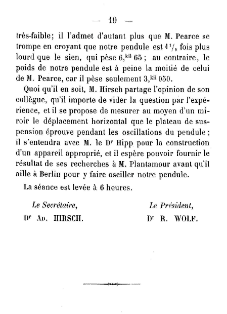 En cualquier caso, el Sr. Hirsch comparte la opinión de su colega de que es importante dilucidar la cuestión mediante la experiencia, y se propone medir por medio de un espejo el desplazamiento horizontal que la plataforma de suspensión experimenta durante las oscilaciones del péndulo; se pondrá de acuerdo con el Sr. Dr. Hipp para la construcción del aparato apropiado, y espera poder mostrar el resultado de sus investigaciones al Sr. Plantamour antes de que se vaya a Berlín para hacer oscilar allí nuestro péndulo. Se levanta la sesión a las 6. |