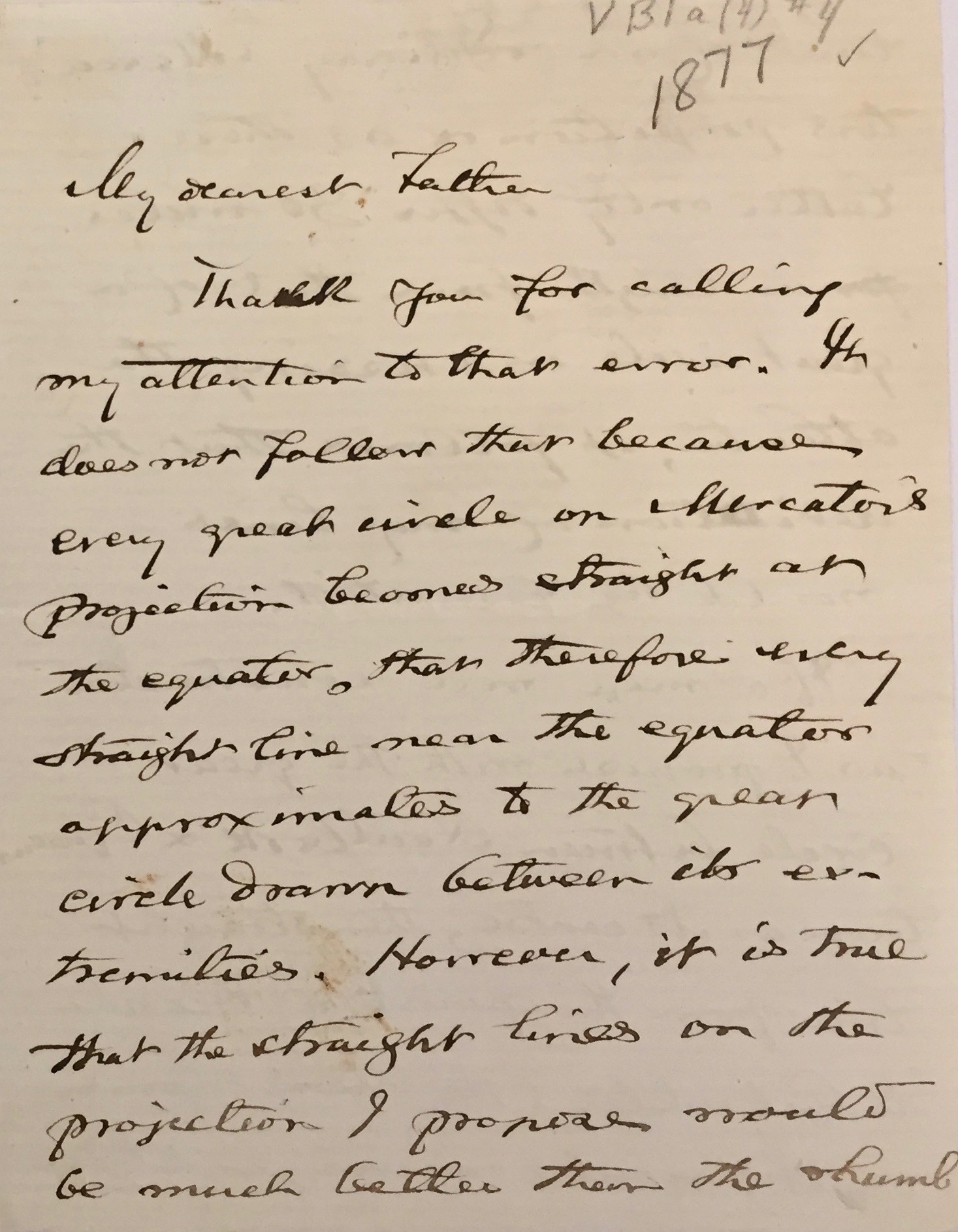 My dearest Father, Thank you for calling my attention to that error. It does not follow that because every great circle on Mercator's Projection becomes straight at the equator, that therefore every straight line near the equator approximates to the great circle drawn between its extremities. However, it is true that the straight lines on the projection I propose would be much better than the shumb (?) |