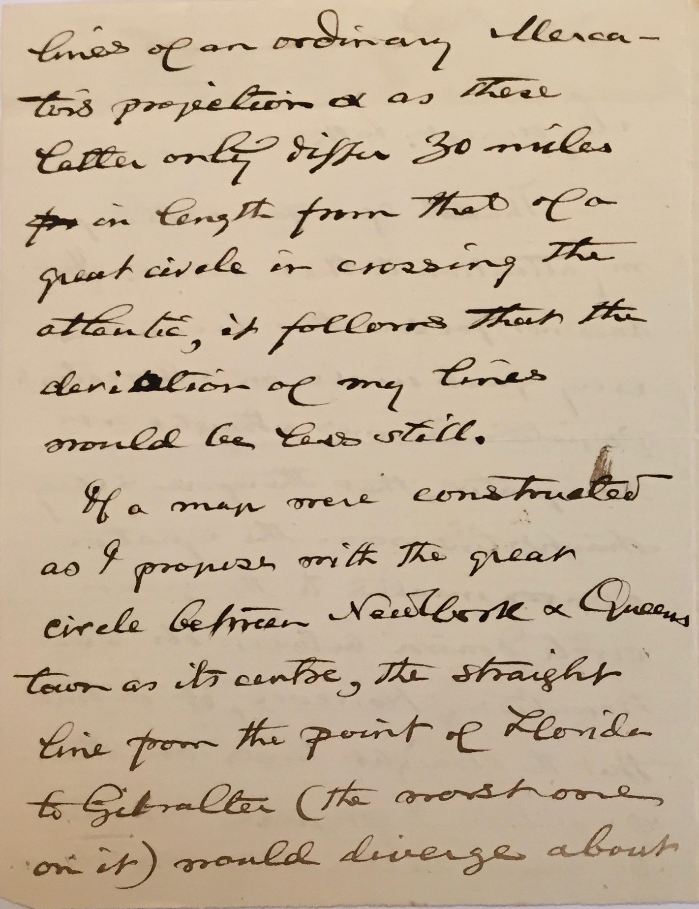lines of an ordinary Mercator's projection & as these latter only differ 30 miles in length from that of a great circle in crossing the Atlantic, it follows that the deviation of my lines would be less still.