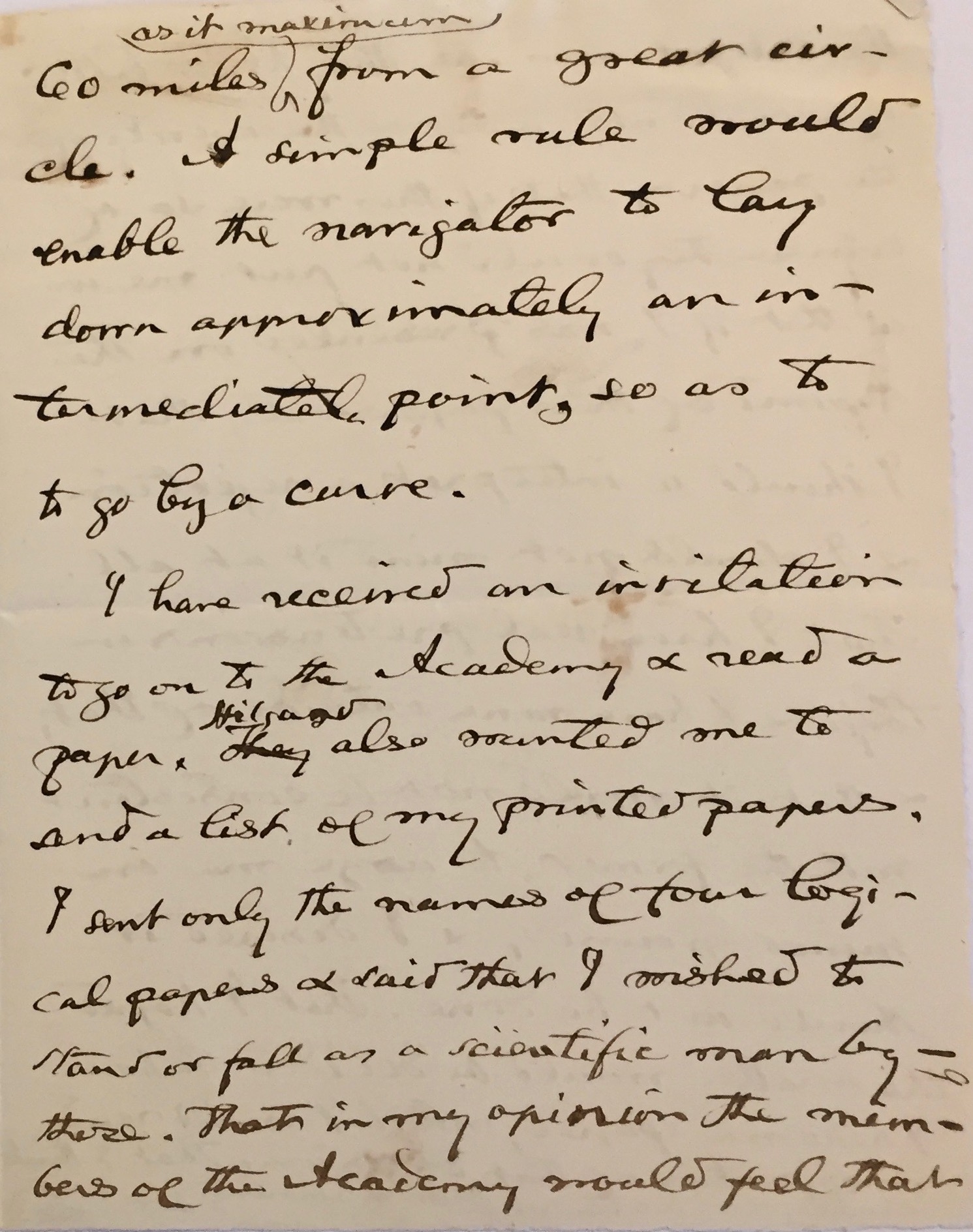 I have received an invitation to go on to the Academy & read a paper. Hilgard also wanted me too and a list of my printed papers. I sent only the names of four logical papers & said that I wished to stand or fall as a scientific man by those. That in my opinion the members of the Academy would feel that
