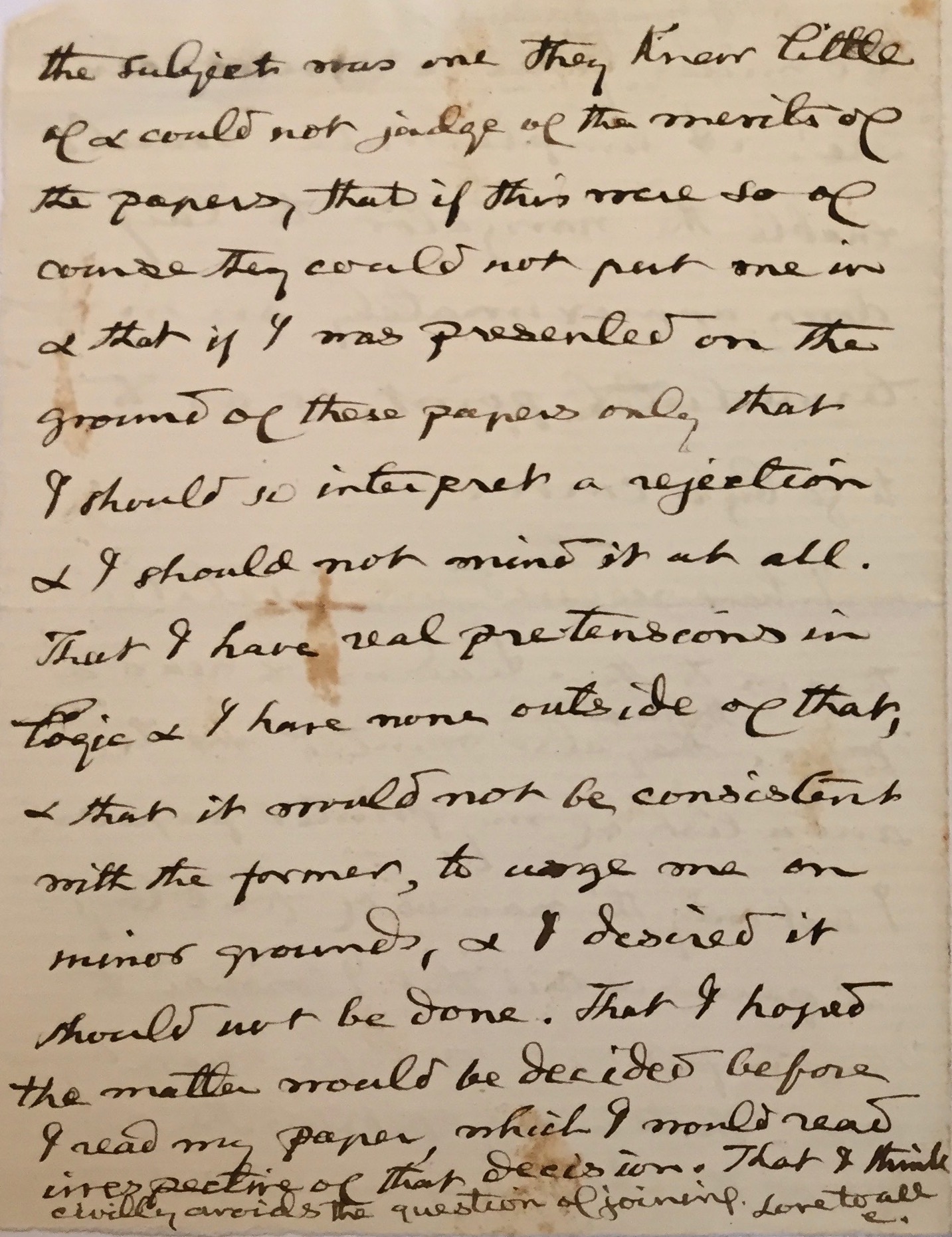 the subject was one they knew little of & could not judge of the merits of the papers, that if this were so of course they could not put me in & that if I was presented on the ground of these papers only that I should so interpret a rejection & I should not mind it at all. That I have real pretensions in logic & I have none outside of that, & that it would not be consistent with the former, to urge me on minor grounds, & I desired it should not be done. That I hoped the matter would be decided before I read my paper, which I would read irrespective of that decision. That I think civilly avoids the question of joining.