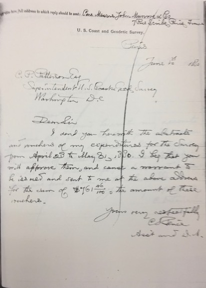 Sr. C. P. Patterson Superintendente U. S. Coast & Geod. Survey Washington D. C. Muy estimado Señor, Le envío aquí los resúmenes y recibos de mis gastos del 23 de abril al 31 de mayo de 1880. Le ruego que los apruebe y haga que se emita y se me envíe a la dirección arriba indicada un cargo por la suma de 761,46 dólares, la cantidad de estos recibos1. C. S. Peirce