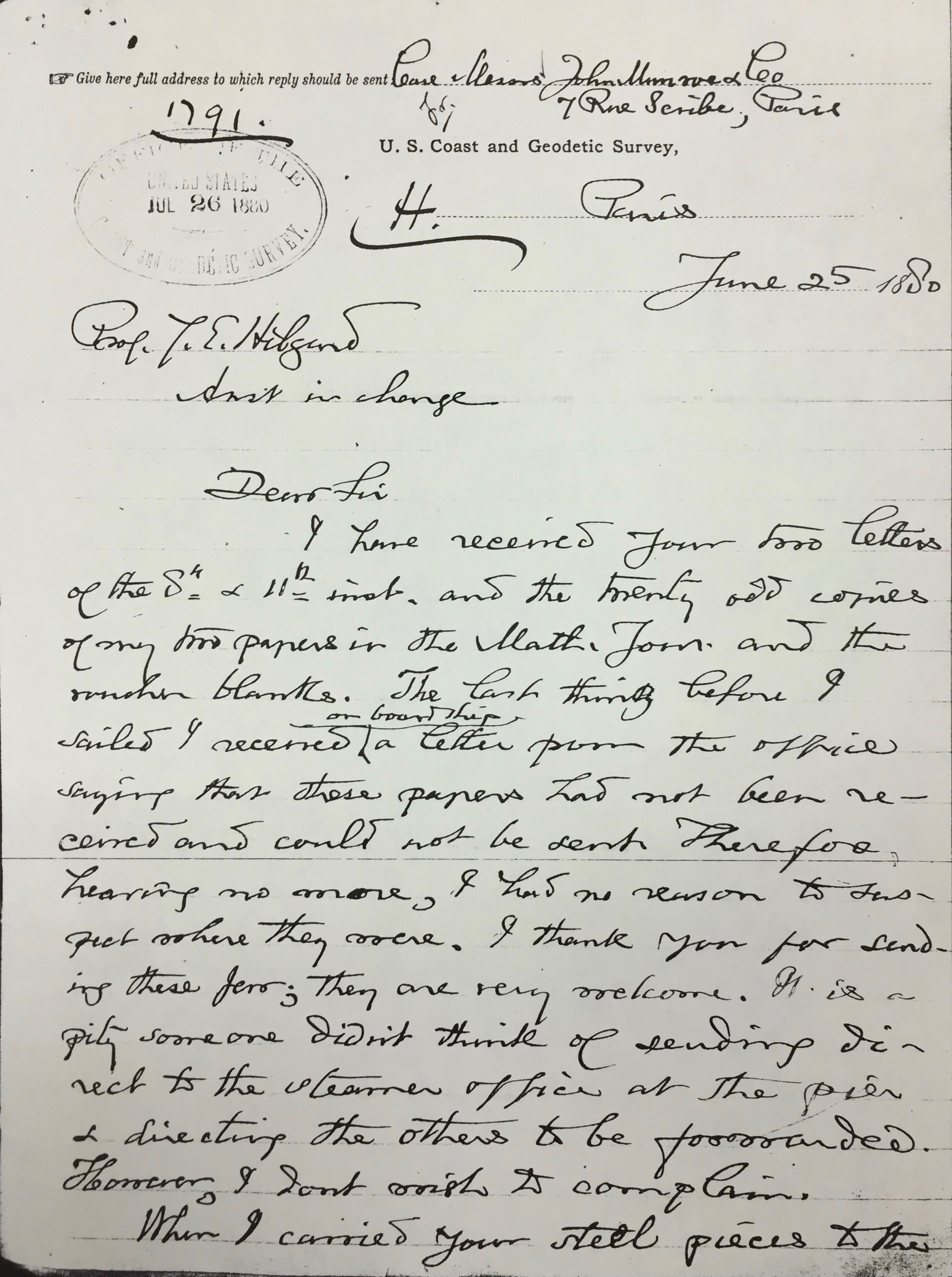 Esta carta fue escrita por C. S. Peirce a Julius E. Hilgard, del U. S. Coast Survey, el 25 de junio de 1880 desde París, acusando recibo de unos artículos suyos que había pedido.