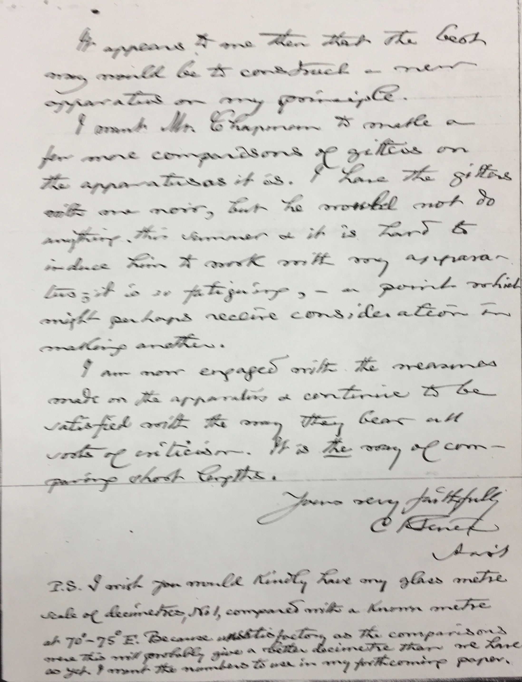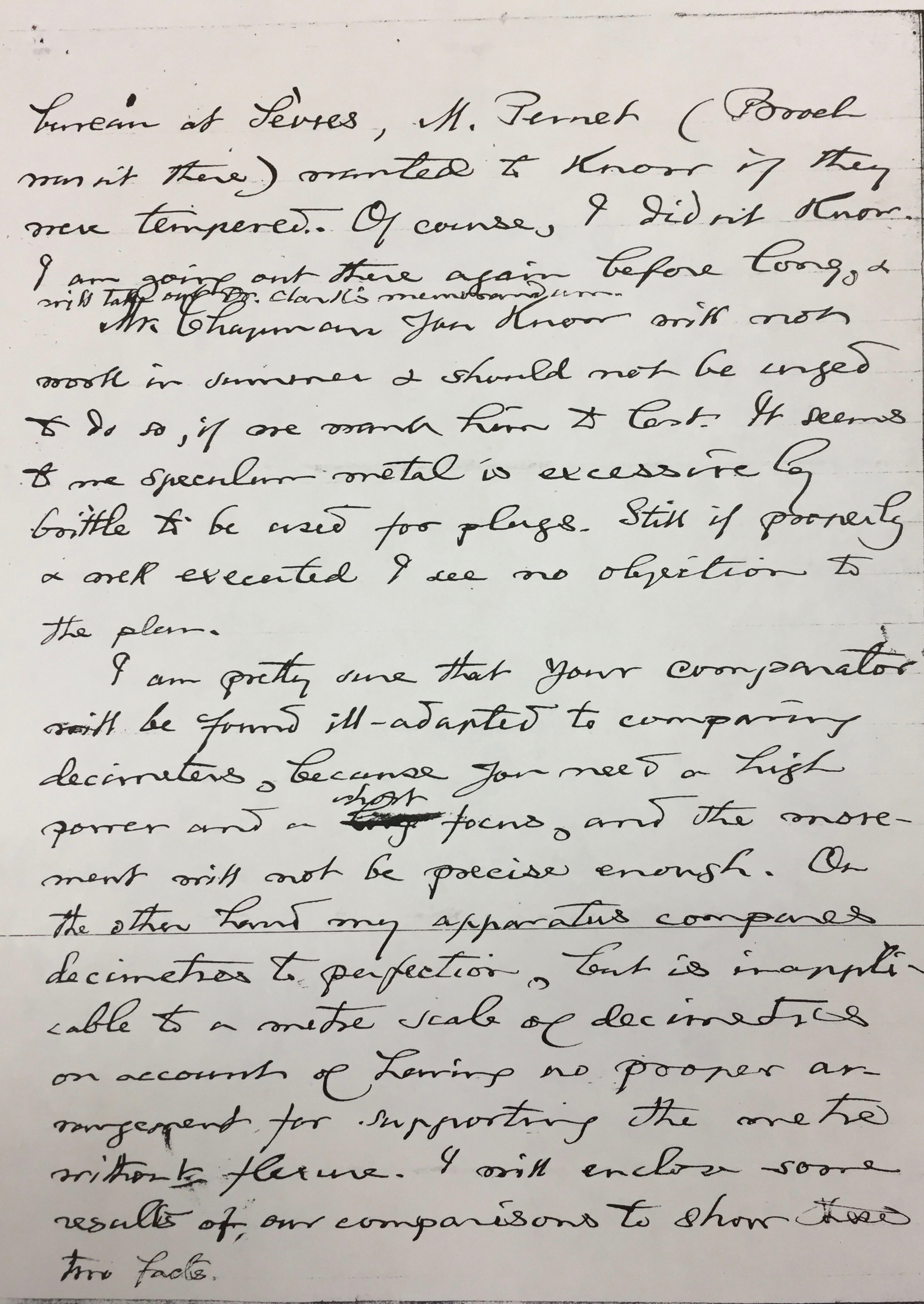 Como sabe, el Sr. Chapman no trabajará en verano y no se le debería instar a que lo haga si se quiere que dure. Me parece que un espéculo de metal es excesivamente frágil para ser usado para enchufes. Sin embargo, si se ejecuta bien y de manera apropiada no veo objeción al plan. Estoy bastante seguro de que se verá que su comparador no se adapta bien para comparar decímetros, porque se necesita una gran potencia y un foco pequeño y el movimiento no será lo suficientemente preciso. Por otra parte, mi aparato compara decímetros a la perfección, pero no se puede aplicar a una escala métrica de decímetros al no tener una disposición apropiada para soportar el metro sin flexión. Incluiré algunos resultados de nuestras comparaciones para mostrar estos dos hechos.