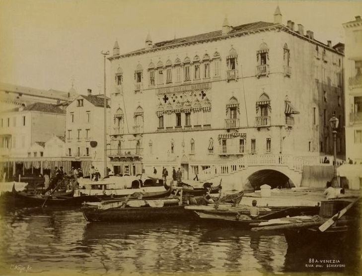 ![]() Fotografía de época de Carlo Naya (1816-1882) del Hotel Royal Danieli de Venecia. Puede verse a la izquierda una página de la agenda del general Henry. L. Abbot, en la que menciona el alojamiento previsto en Venecia (Diaries Ms Am 1447.1447.3, 1870, Houghton Library). |