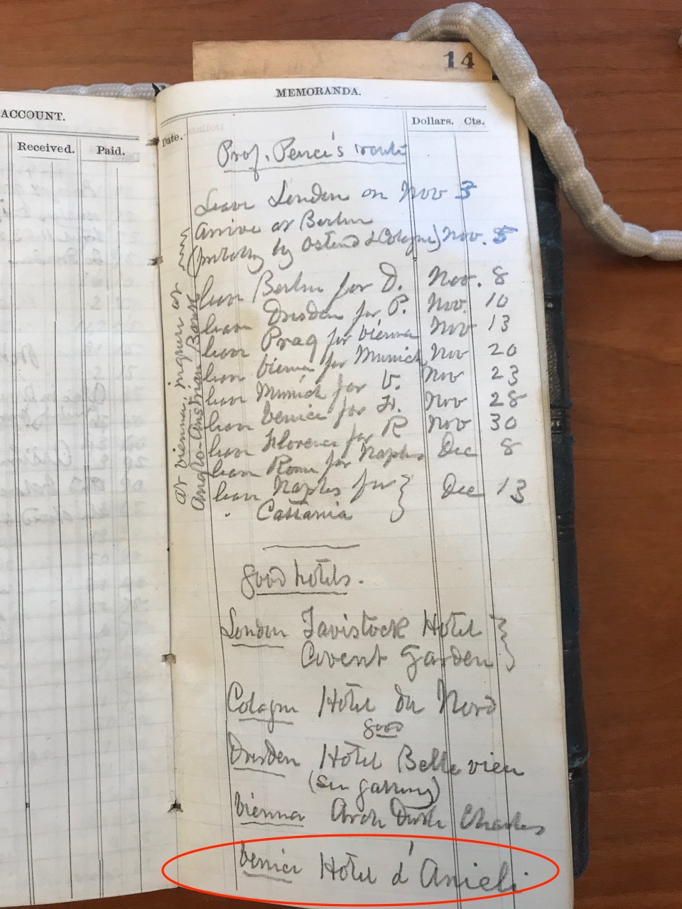 Después de su viaje de exploración preparatoria por Grecia, Italia y España, Charles S. Peirce se reunió con su padre Benjamin y su esposa Zina en Munich el 20 de noviembre de 1870. Desde Munich se dirigieron hacia el sur de Italia para la observación del eclipse en Sicilia el 22 de diciembre, pasando por Venecia, Florencia, Roma y Nápoles. Se conservan pocos datos de este viaje que Charles S. Peirce y su esposa hicieron junto con algunos otros miembros de la expedición norteamericana y varios amigos de Benjamin Peirce como Thomas W. Parsons y su esposa, Anna M. Allen [Fuente: cf. Zoltán Haraszti (ed.), Letters by T. W. Parsons, Boston, MA, Trustees of the Public Library, 1940, p. 83]. En su diario el general H. L. Abbot, que formaba parte de la expedición norteamericana, indica el Hotel Danieli de Venecia como el previsto para el alojamiento del grupo de Benjamin Peirce (Memoranda, diario 1870). Se conservan dos documentos con el programa de este viaje de Benjamin Peirce por Italia. En ambos la expedición prevé llegar a Venecia el día 24 de noviembre, estar allí cuatro días y abandonar esa ciudad camino de Florencia el día 28. En la agenda el general Abbot se prevé que el profesor Peirce llegue a Venecia el 28 de noviembre y se marche a Florencia el 30. |