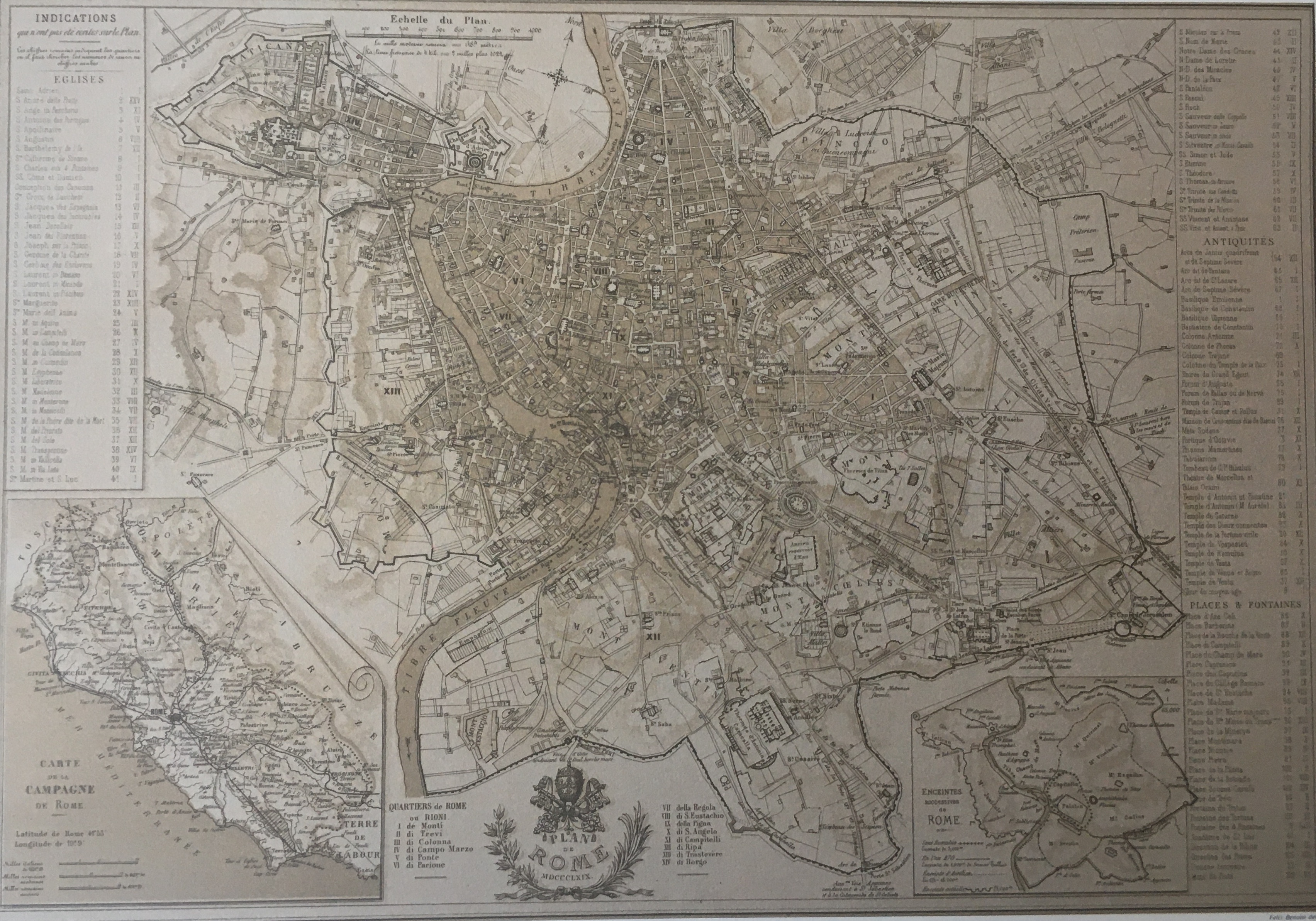 Philippe Benoist, Rome dans sa grandeur, 1870 Describiré simplemente lo que he hecho hoy y puede tomarse como una buena muestra de todos mis días. He empezado cerca de las 10, pues a mí me parece y los médicos me dicen que es malo para mí madrugar demasiado. Comienzo a propósito sin prisa. Primero he ido al Colegio Romano para ver el Museo Kircheriano, que no imaginaba especialmente interesante pero que era una de las pocas cosas abiertas en domingo. (...) Después he tomado un coche y me ha llevado hasta las Catacumbas de Calixto, un largo trayecto. Por el camino hemos pasado la Colina Palatina con algunas antiguas ruinas sobre ella, no sé de qué, quizá de un palacio imperial. Hemos pasado por debajo de un arco triunfal erigido en honor de un tal Claudio Druso Germánico 8 a. C. Tiene dos columnas de mármol y es bastante bonito. A partir de ahí hemos salido de la ciudad por la puerta de San Sebastián, una estructura medieval de ladrillo bastante imponente. A la entrada de las Catacumbas de Calixto hay una pequeña capilla que evidentemente es muy antigua. Ya no se usa como iglesia (...)