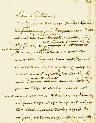 Señoras y caballeros, Desde nuestro último encuentro, Herbert Spencer se ha ido y han leído la semblanza1 que ha hecho de él el profesor James que no olvida ni su faceta de filósofo ni la de hombre, y que no contiene nada que no sea verdad. No sé si la inconsistencia de Spencer en materia de religión está remarcada un poco demasiado fuerte; porque me parece que ninguno de nosotros, desde el Papa2 hasta Huxley3, sería tan inconsistente en este tema como Spencer; y desde el punto de vista de la religión efectiva, las inconsistencias teóricas permiten el único modo que todavía tenemos de ver las dos |
