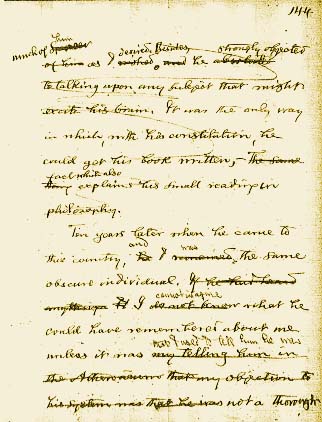 Diez años más tarde5, cuando vino a este país, yo era el mismo individuo oscuro. No puedo imaginar qué pudo hacerle acordarse de mí a no ser lo que yo solía decirle: que él no era [borrado: lo que le dije en el Athenaeum Club fue que mi objeción a su sistema era que él no era] |
