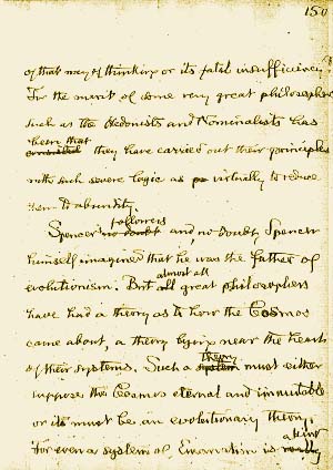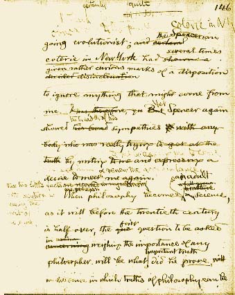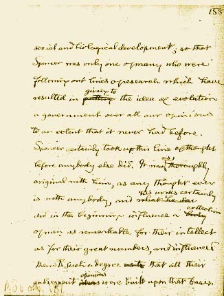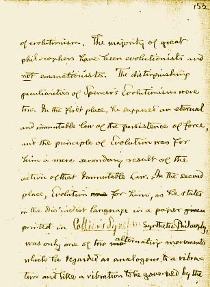 un evolucionista completo [borrado]: y la camarilla spenceriana más importante en Nueva York había mostrado varias veces curiosos signos de una disposición decidida a inclinarse a ignorar cualquier cosa que viniera de mí. Sin embargo, Spencer de nuevo mostró la amplitud de sus simpatías escribiéndome y pidiéndome que nos viéramos y retomáramos el contacto6. Estos dos pequeños hechos merecen ser contados para mostrar el espíritu de este hombre.