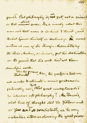 probadas. Pero la filosofía no es, todavía, una ciencia en esta sentido estricto. Es simplemente lo que este hombre o aquel hombre afirma pensar; y Herbert Spencer mismo al declinar el nombramiento como uno de los Asociados Extranjeros de la Academia de Ciencias de París, basó su declinación en que su trabajo no era un trabajo científico.