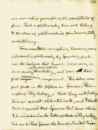 Otras concepciones, sin embargo, fueron introducidas en la filosofía por Spencer, como fue la doctrina de que las ideas innatas son, en algún sentido, por algunos medios, hereditarias, y su primera aparición es empírica. Esta idea fue planteada en los cincuenta en los Principles of Psychology de Spencer, un libro muy anterior al famoso libro de Fechner; y yo debería haber supuesto que Spencer tenía alguna pretensión de ser considerado el Padre de la Psicología Moderna, pero el prof. James quien sabe cien veces |