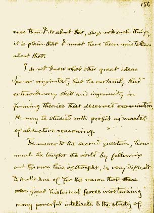 No sé qué otras grandes ideas originó Spencer, pero ciertamente tuvo una extraordinaria habilidad e ingeniosidad para plantear teorías que merecen ser examinadas. Él puede ser estudiado con aprovechamiento como un maestro del razonamiento abductivo10. La respuesta a la segunda cuestión, cuánto enseñó al mundo desarrollando su propia línea de pensamiento, es muy difícil de asegurar porque grandes fuerzas históricas se agitaban en muchos intelectos poderosos para el estudio del |