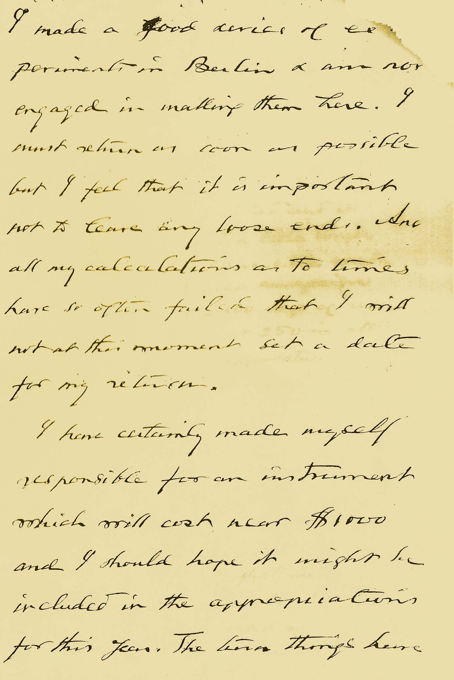 Hice una buena serie de experimentos en Berlín, y estoy ahora haciéndolos aquí. Debo volver lo antes posible, pero siento que es importante no dejar ningún cabo suelto. Y todos mis cálculos sobre tiempos han fallado tan a menudo que en este momento no estableceré una fecha para mi regreso. Me he hecho en efecto responsable de un instrumento que costará cerca de 1.000 dólares y que yo esperaría que pudiera incluirse en las partidas para este año. El giro que han tomado las cosas |