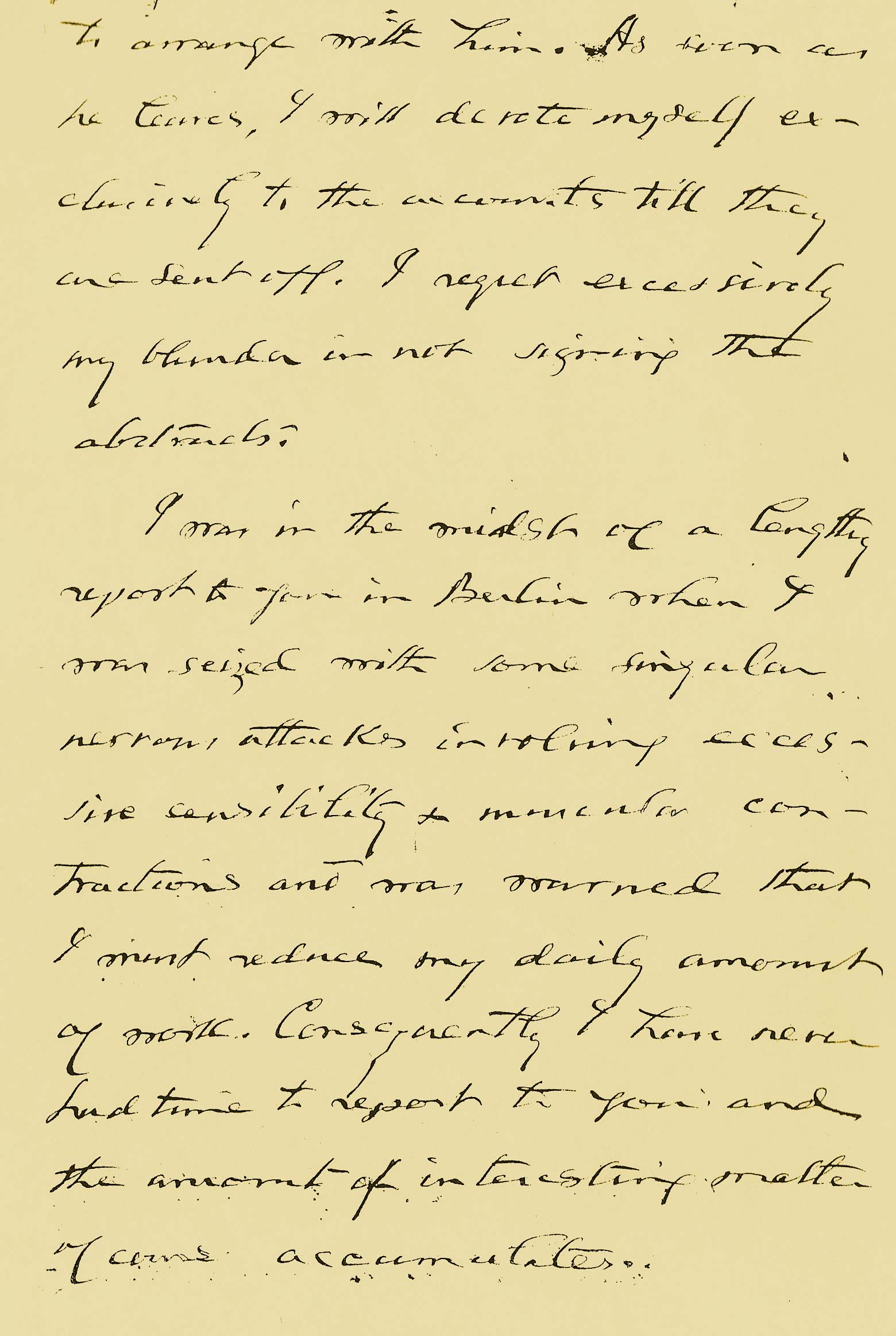 En Berlín estaba en mitad de un extenso informe para usted cuando sufrí unos singulares ataques nerviosos con una excesiva sensibilidad y contracciones musculares, y fui advertido de que debía disminuir mi cantidad diaria de trabajo5. Como consecuencia no he tenido nunca tiempo para informarle, y la cantidad de cuestiones interesantes por supuesto se acumulan. |