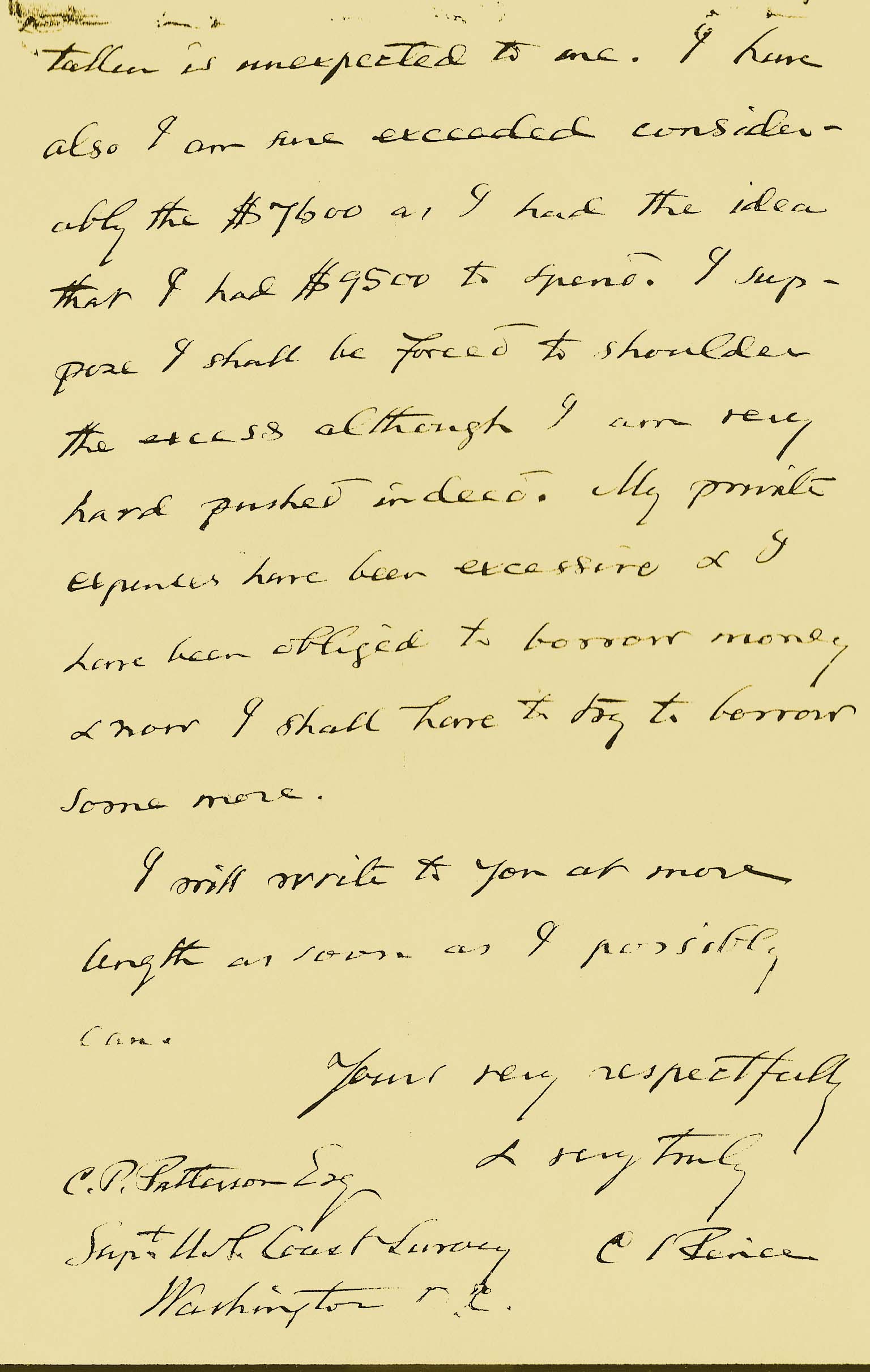 3. Como explicará Peirce detenidamente en la otra carta a Patterson del 6 de julio, para las determinaciones del tiempo en la oscilación del péndulo eran indispensables dos personas. Ante la marcha de Farquhar el día 15 tiene previsto intensificar las mediciones en los días que quedan antes de la marcha de su asistente.